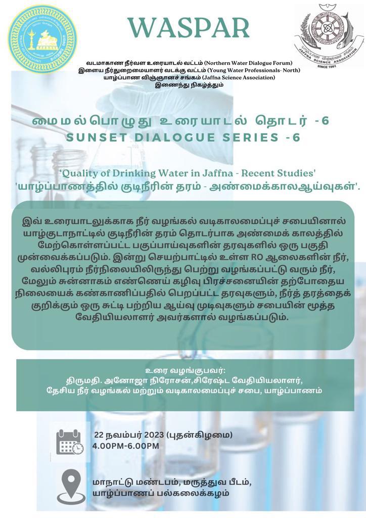 The 6th Sunset Dialogue Series, which will be on the topic of ‘Quality of Drinking Water in Jaffna – Recent Studies யாழ்ப்பாணத்தில் குடிநீரின் தரம் – அண்மைக்கால ஆய்வுகள்‘ by Mrs Anoja Nirosan, Senior Chemist, National Water Supply and Drainage Board, Jaffna.